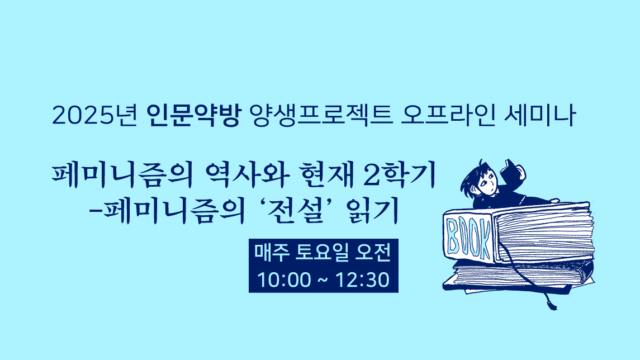 모집중2025년 인문약방 양생프로젝트(오프라인)페미니즘의 역사와 현재 2학기 모집합니다 (6)2025년 8월23일~12월 13일 토요일 오전 10시벨 훅스, 오드리 로드, 수잔 팔루디, 사라 아메드 공부 -