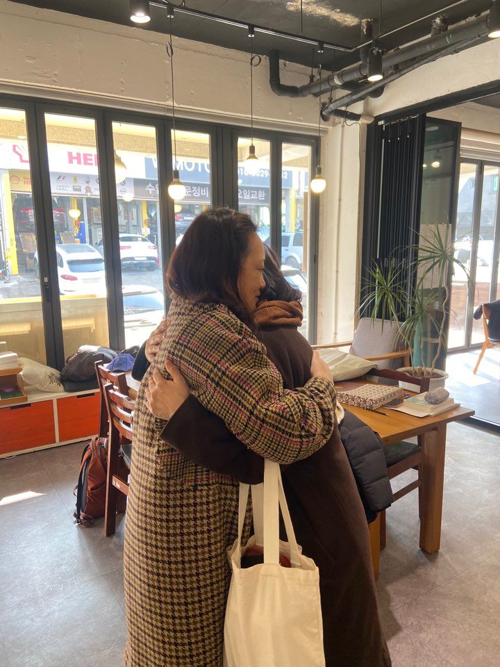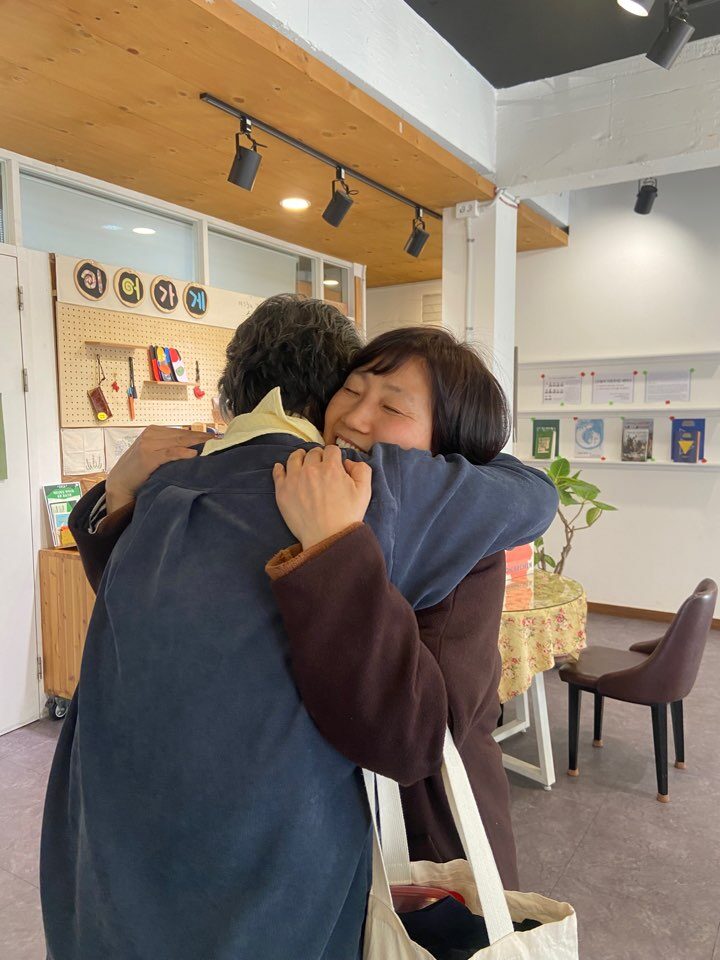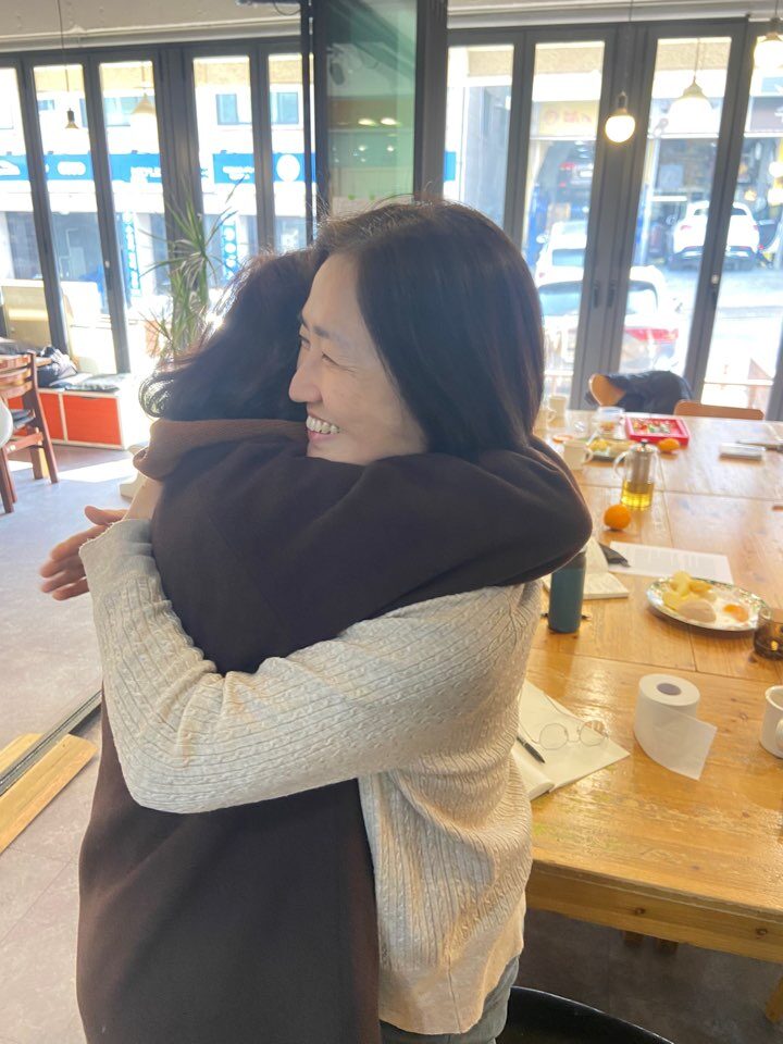 그러더니 다음날에 캐나다에 딸 보러 가는 달팽이님과 서로 꽉 껴안으며 덕담을 주고받았다. 달팽이님도 연거푸 “와, 노라랑 안으니까 좋다 좋아” 하는데, 갑자기 나에게 안자고 할까 봐 거리를 두었다. 그리고 카메라를 들이대며, 다른 사람들과 서로 안으라고 부추겼다. 나는 그 포옹의 현장에 들어서고 싶지 않았다. 윽, 낯간지러워~~