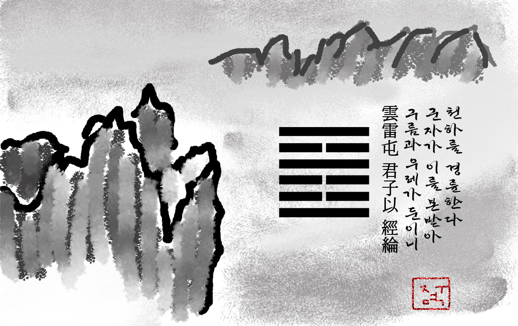 <대상전>은 주역의 괘 상징에 한 줄의 문자를 더해 한 폭의 문인화를 그린 듯이 보입니다.
