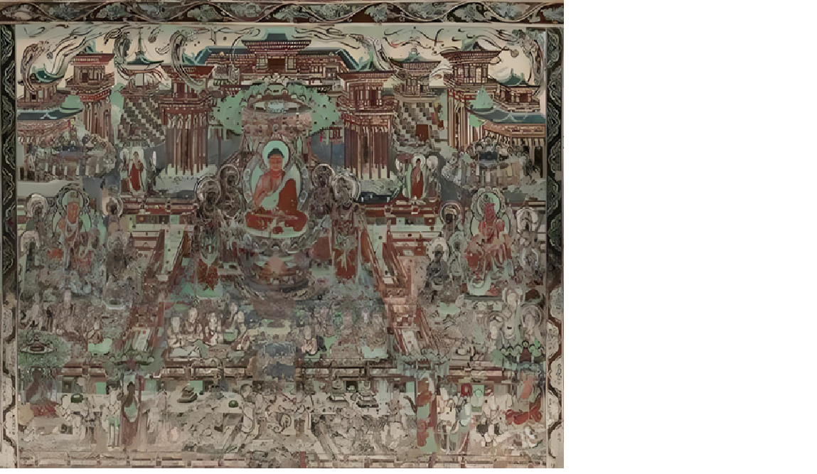 아미타경변상도 (막고굴 제217굴 북벽, 관무량수경변상도) - 아미타불 좌우에는 관세음보살과 대세지보살이 있으며, 극락세계에 죽은 이의 영혼을 맞이하는 영접도(來迎圖) 형태가 대표적이다. 중단부에는 호수와 연꽃, 음악과 무희, 비천, 보탑 등이 어우러진 화려한 극락세계가 묘사되며, 연꽃 위에 태어나는 장면도 자주 나타난다.